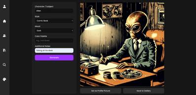 Users can now generate art, set it as their profile pic, and save it to their gallery. Includes smart UI states for feedback and completion.